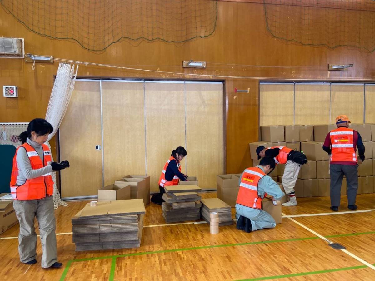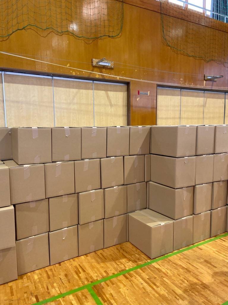 1件目のニーズ:午前午後と「いわき市内郷コミュニティセンターの避難所」で、段ボールベッドの組み立て作業、避難者とのコミュニケーションを行いました。