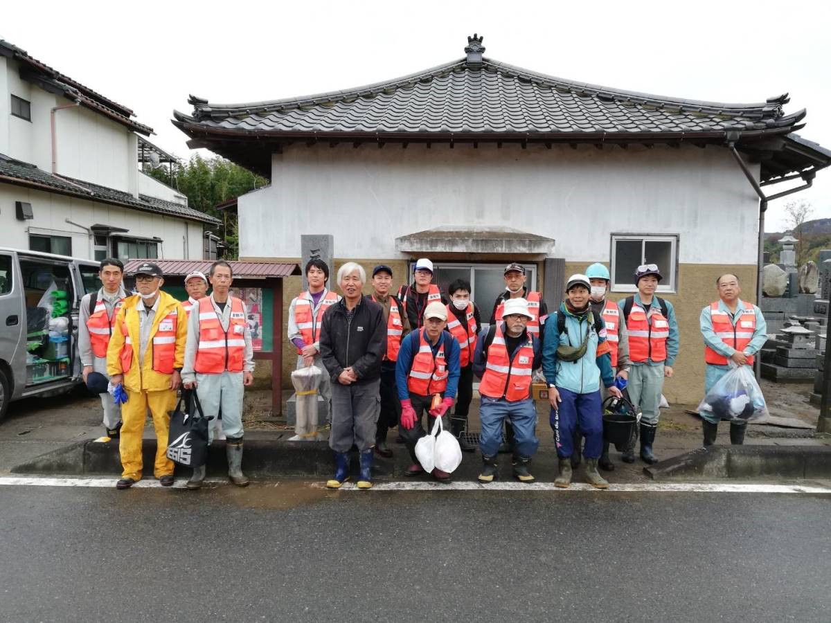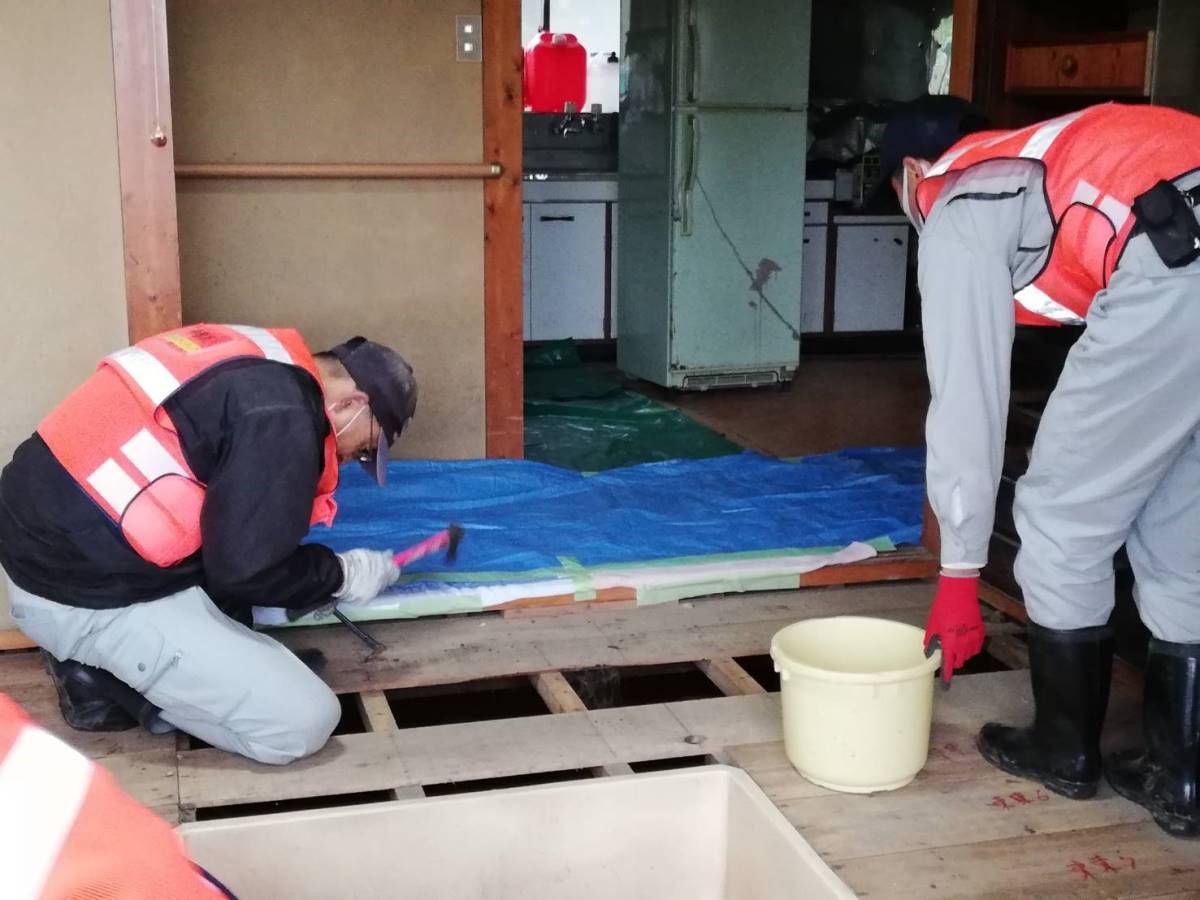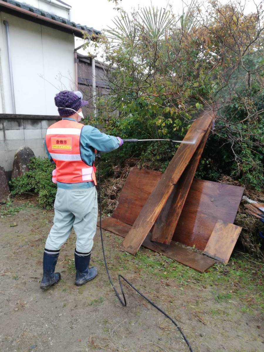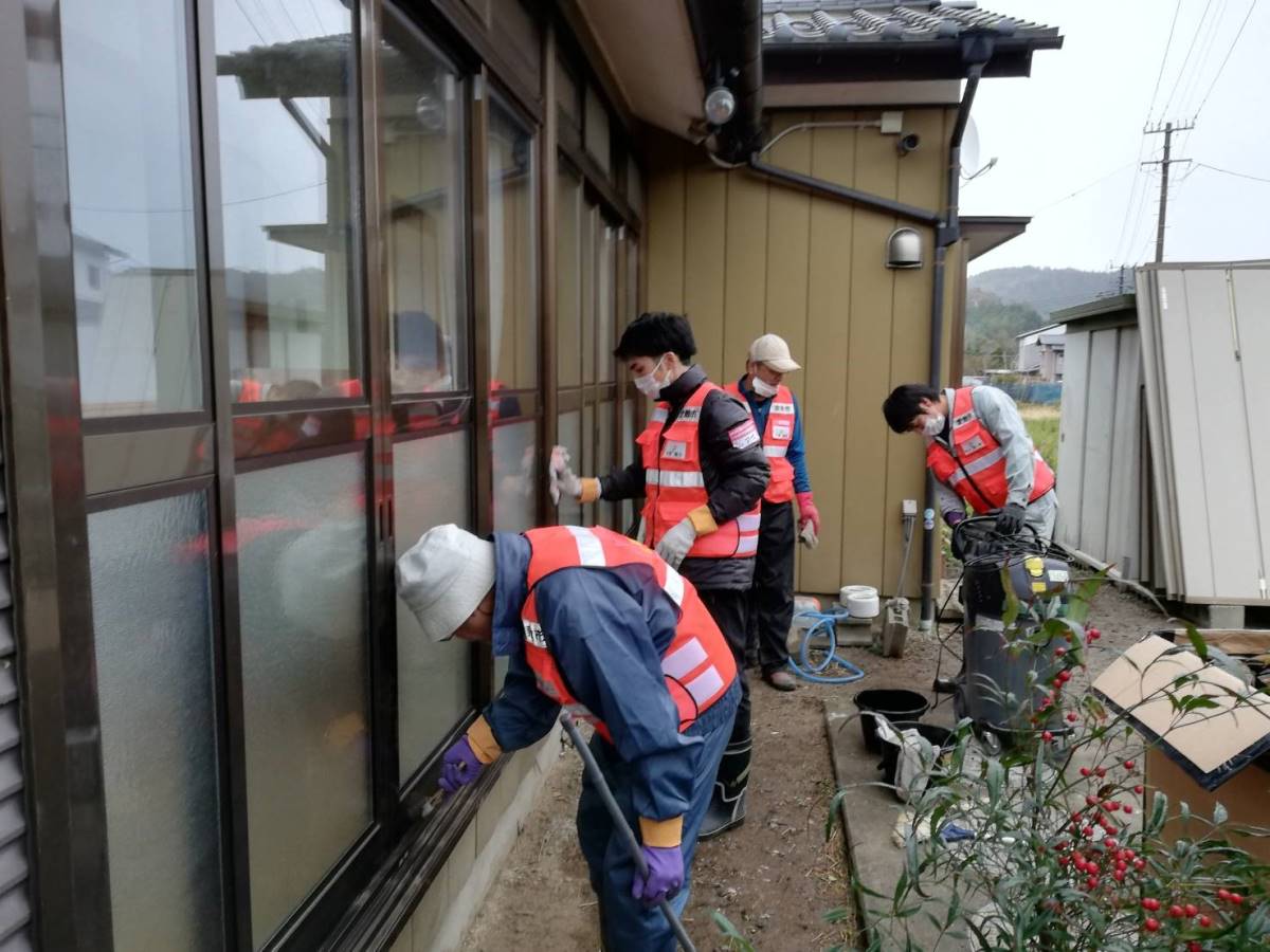 2件目のニーズ:午後からは、午前中に行っていた三島不動堂の床板を高圧洗浄機で洗う作業、民家の雨戸や窓の磨きあげ作業、床板はがし経験者チームによる床板はがし作業、庭先に流入した土砂やごみの搬出作業を行いました。
