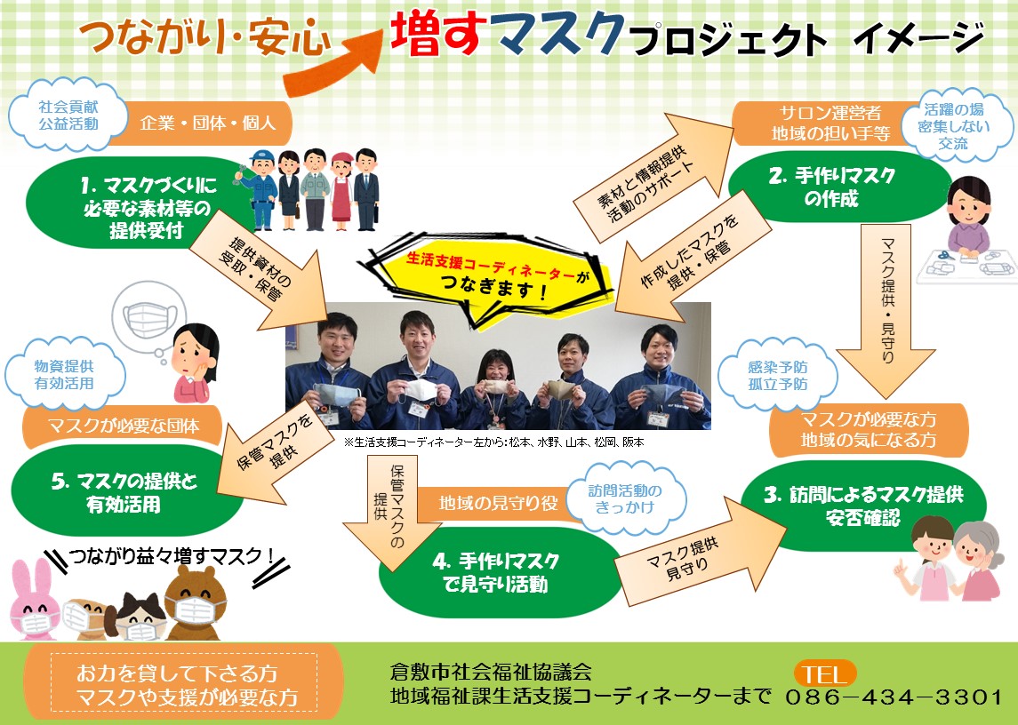 この「つながり・安心増すマスクプロジェクト」は、そのようなコロナウイルス影響下でも、住民同士のつながりを切らぬよう、住民や企業・様々な関係機関とともに、それぞれの「今、できる」を集めて、「今必要な」マスクとつながりが地域をめぐる取り組みとして企画をしています。