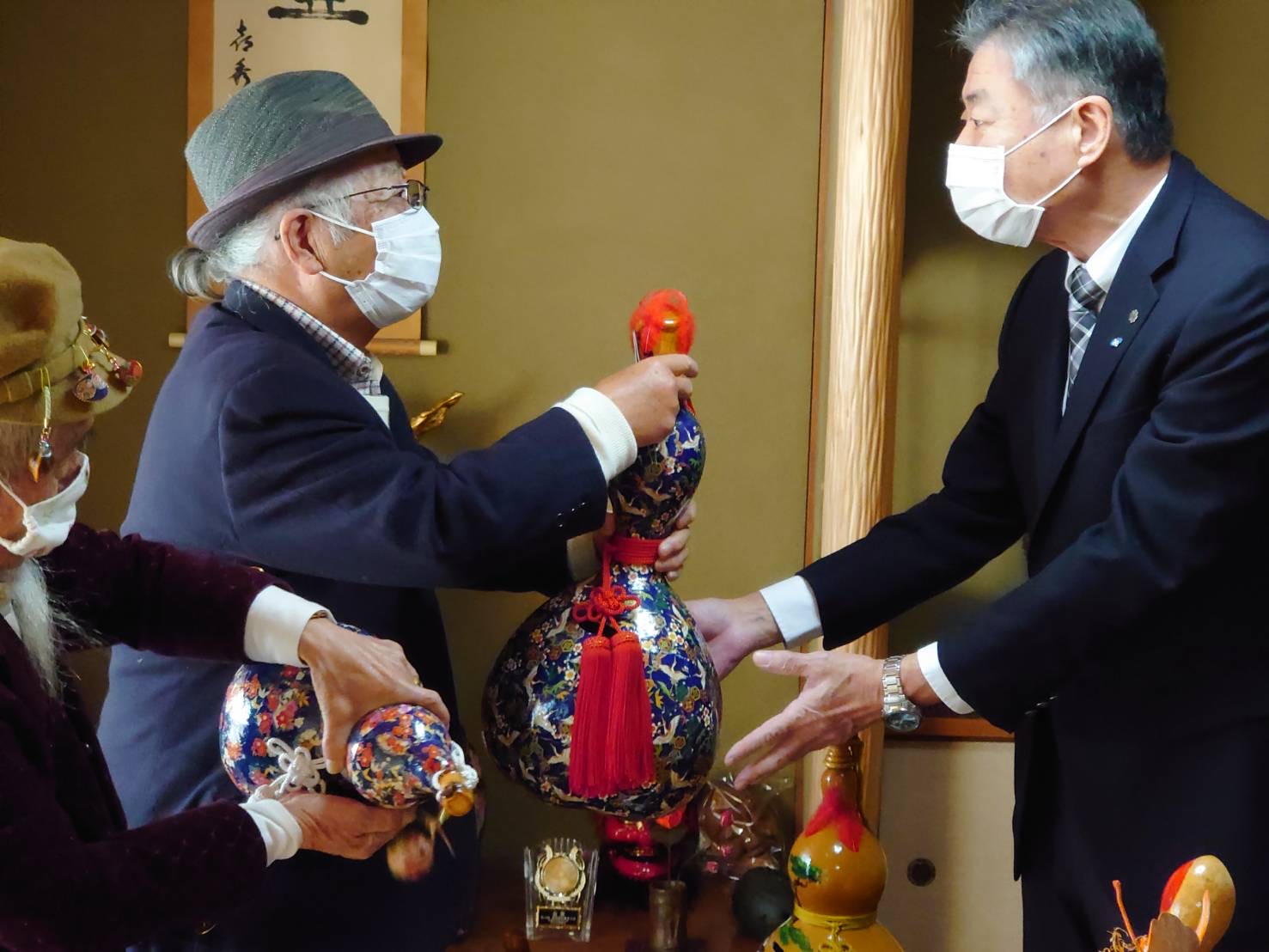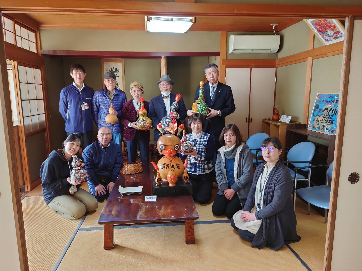 社会福祉法人 王慈福祉会 髙橋 鼎 名誉会長と「ちいきの玉手箱」でものづくりの活動をされている皆様がひょうたんで募金箱を作ってくださり、その中には、倉敷市共同募金委員会のマスコットキャラクター「うさピー」をモチーフにしたものもありました。