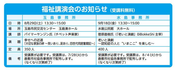 ※冊子版の「くらしき社協だより」令和2年夏号6ページ中段に、福祉講演会のお知らせを掲載して いますが、新型コロナウィルスの感染拡大防止の観点から中止とさせていただきました。 電子版では中止の旨、一部内容を変更して掲載しています。(令和2年6月1日)